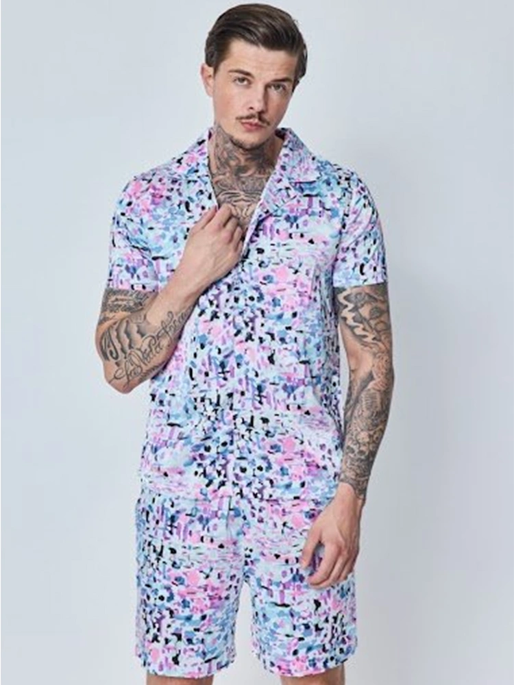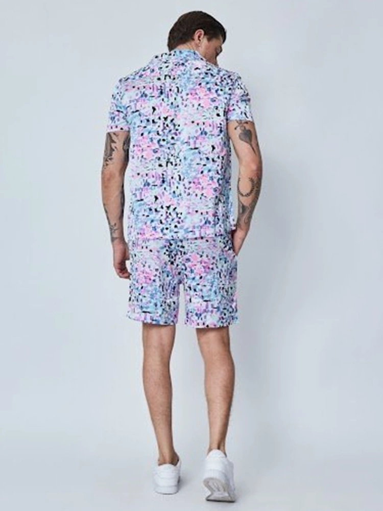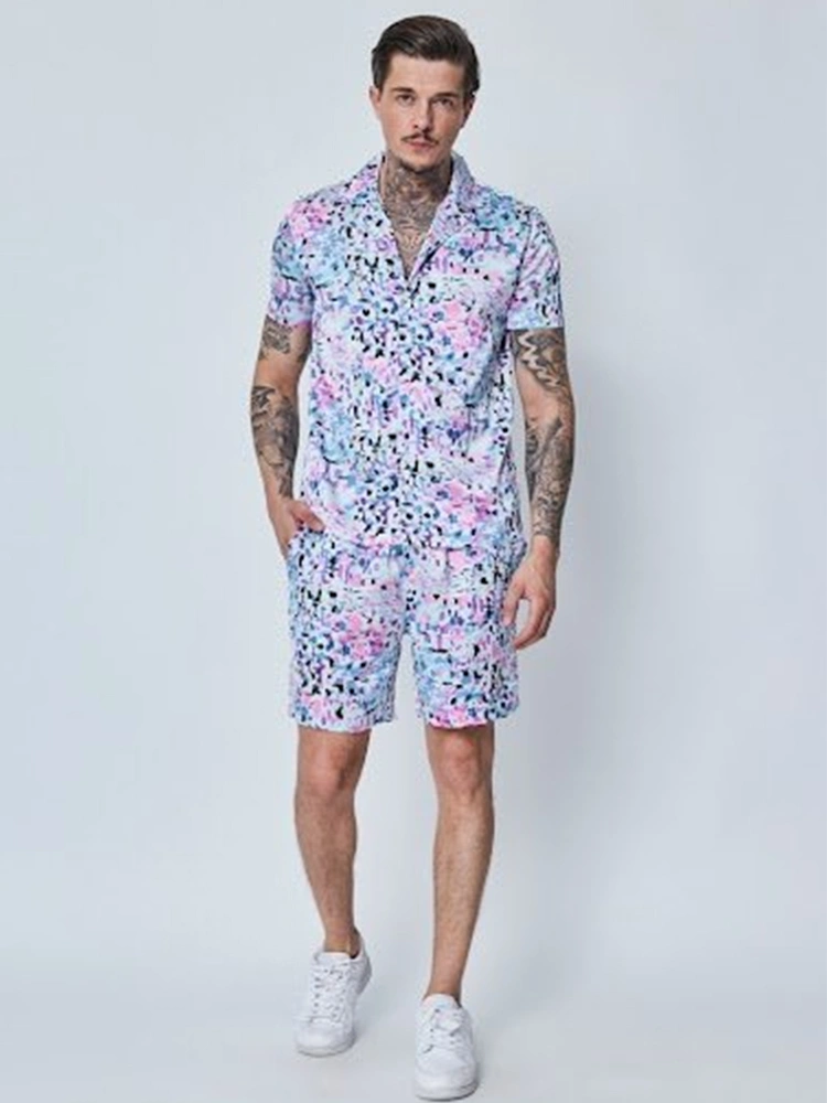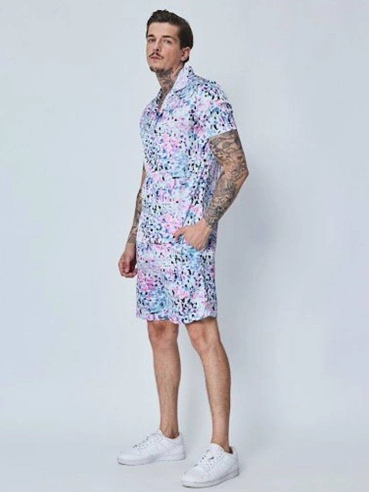 Este compus dintr-o cămașă cu mâneci scurte și un șort, ambele decorate cu un imprimeu abstract în nuanțe de albastru, alb și accente delicate de roz, care evocă un cer senin presărat cu flori delicate. Croiala lejeră și confortabilă a setului îl face ideal pentru zilele calde de vară, iar materialul pare să ofere o textură plăcută la purtare. Poziționarea pe o plajă la apus, cu valurile mării în fundal, adaugă un aer de vacanță și relaxare, completat frumos de încălțămintea albă sport. Acest ansamblu este o alegere îndrăzneață și elegantă, perfectă pentru a ieși în evidență cu stil!